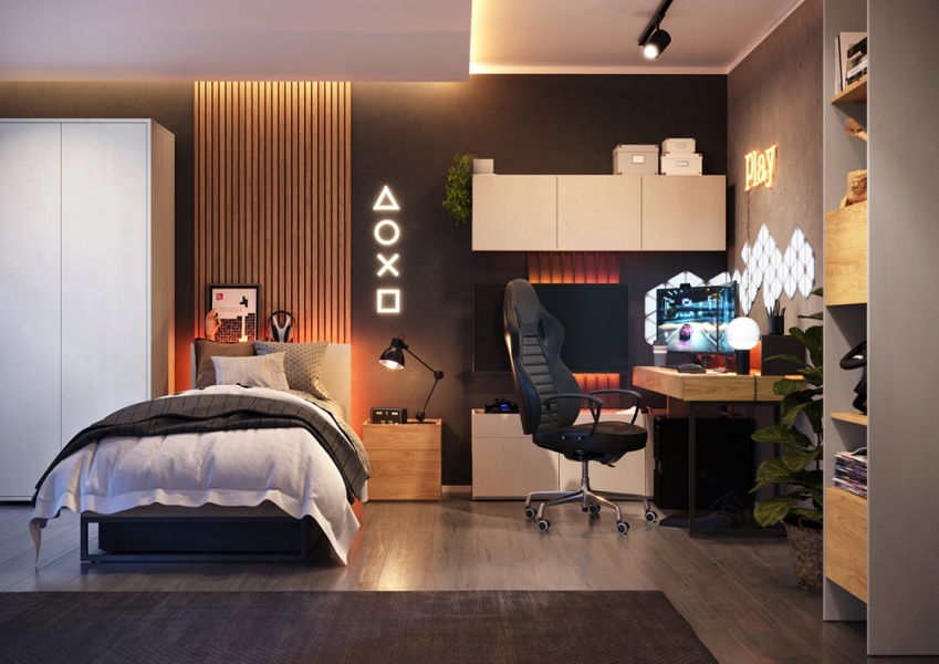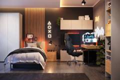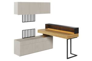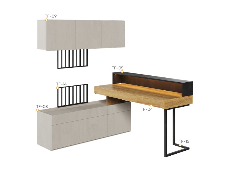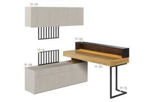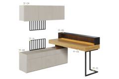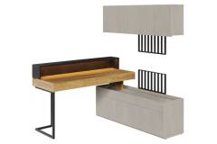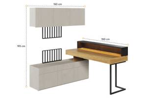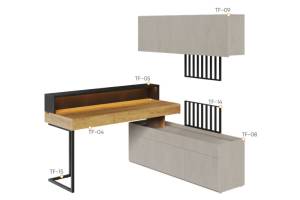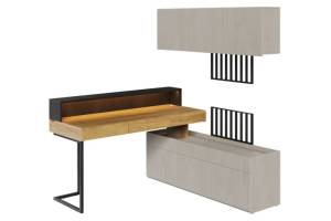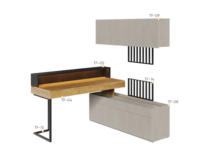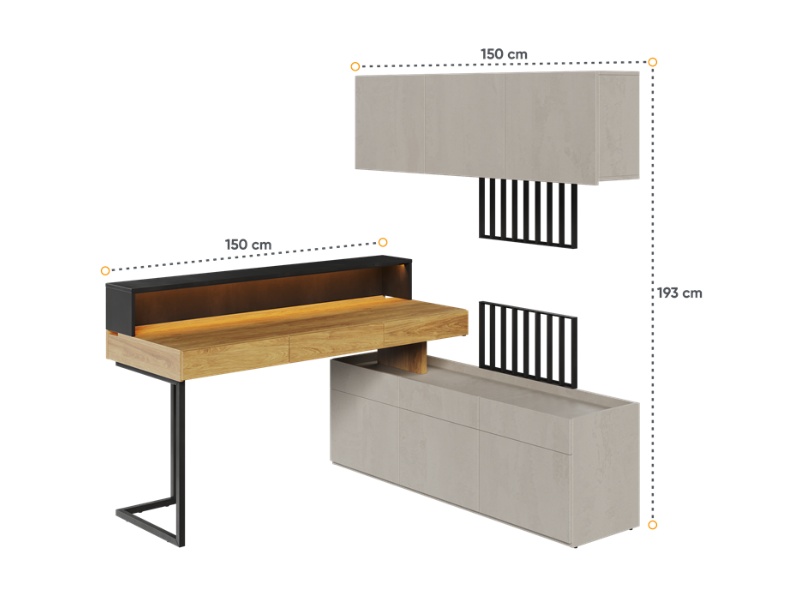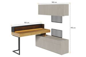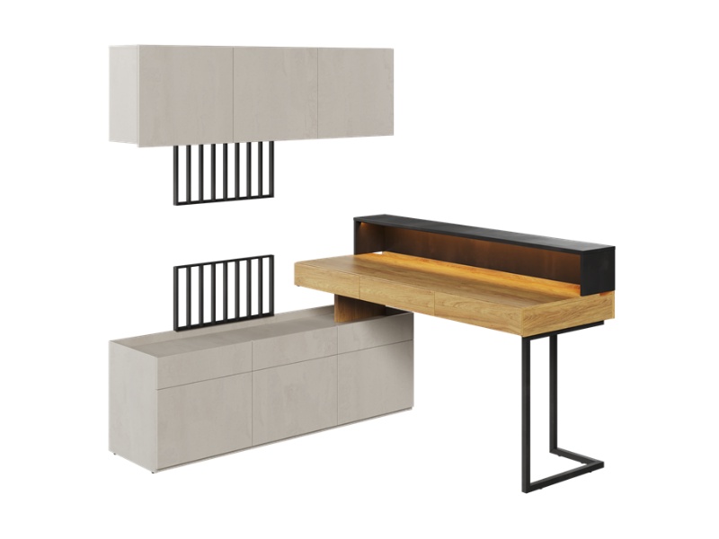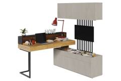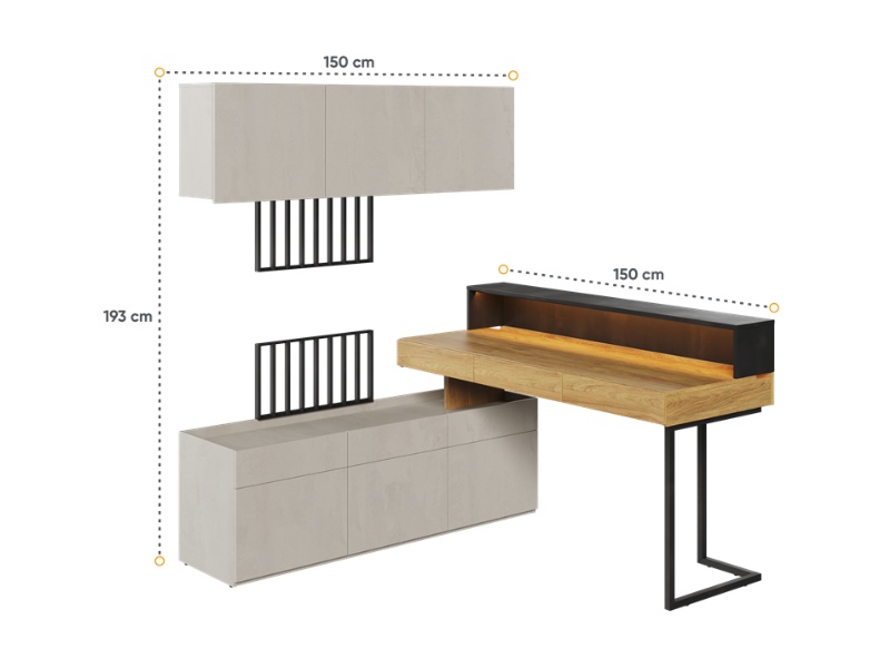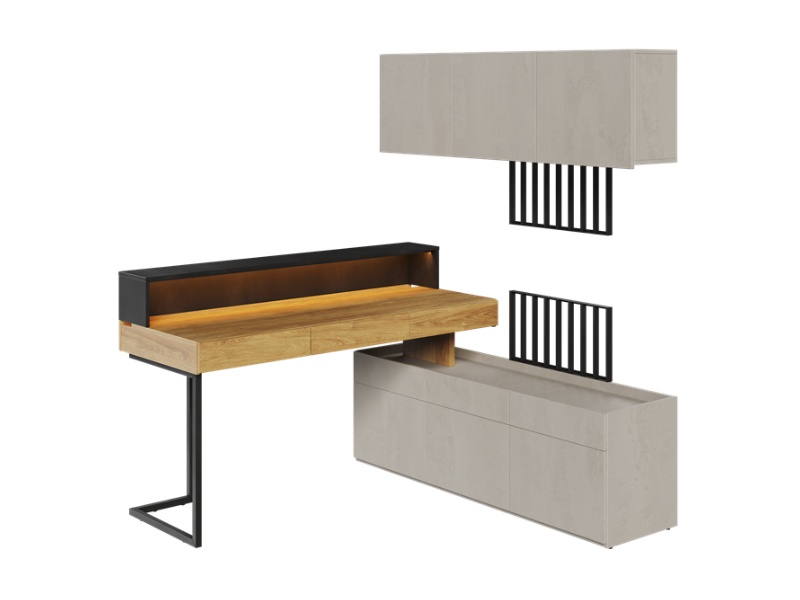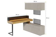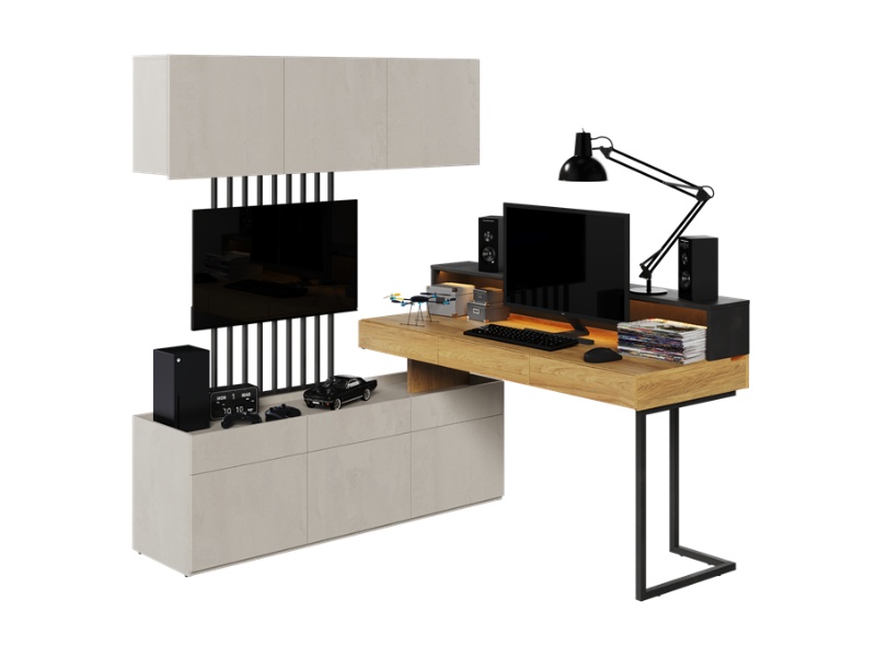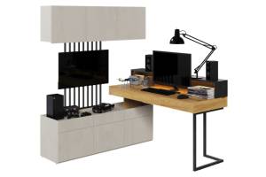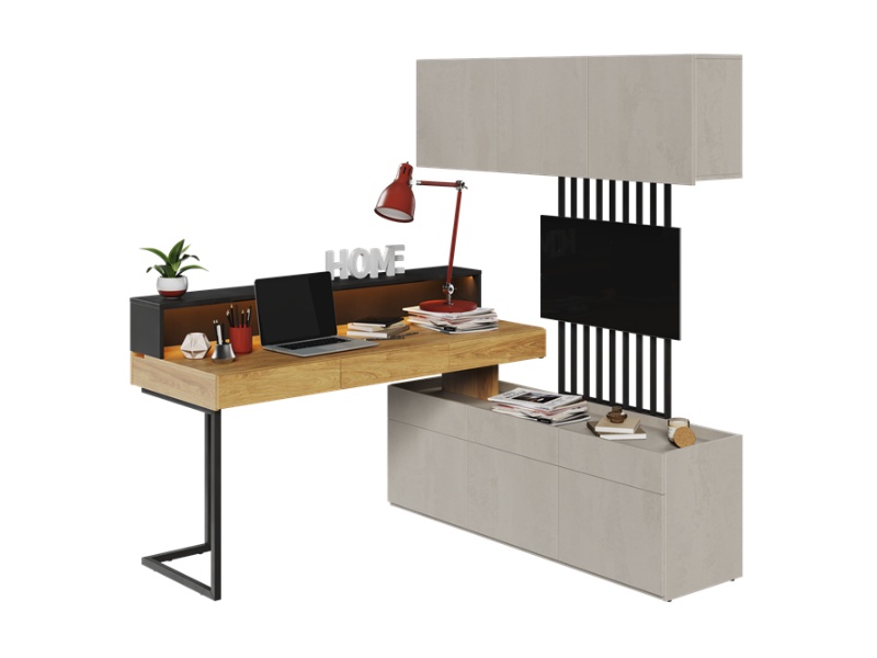 Set birou cu corp suspendat TEEN FLEX 03 150x150x193cm pe colt stanga/ dreapta cu suport pentru suspendat TV, comoda, sistem de iluminare LED