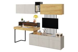 Set birou mic cu corpuri suspendate TEEN FLEX 02 239x193x61cm cu suport pentru suspendat TV, comoda, sistem de iluminare LED