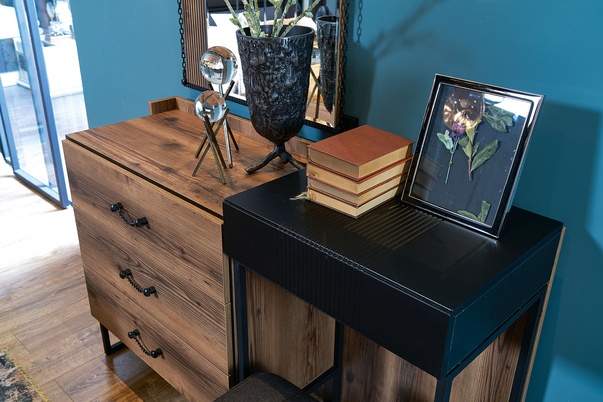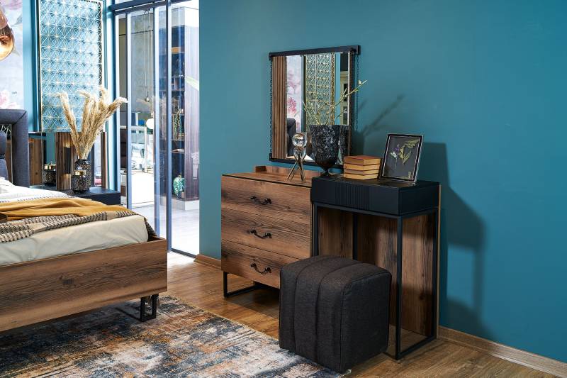 Comoda tip masa make-up cu 4 sertare, oglinda si taburet BOGOTA pemium cu design luxury