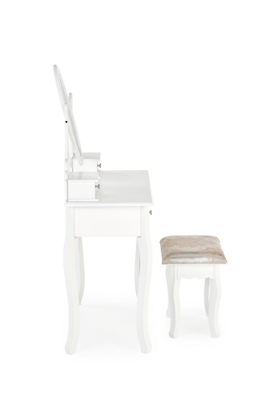 Această masuță este dotată cu o oglindă practică și un taburet tapitat, oferindu-le utilizatorilor o experiență plăcută și funcțională. Culoarea albă a mesei adaugă un aspect modern și luminos în orice cameră. Indiferent dacă este vorba despre aplicarea machiajului sau a produselor de îngrijire a pielii, masa de make-up SARA este concepută pentru a satisface nevoile și preferințele fiecărei persoane.