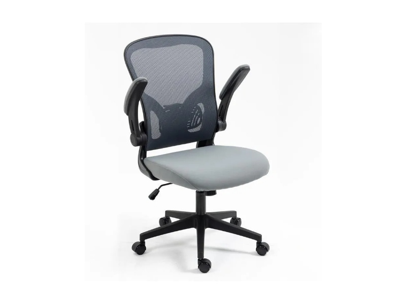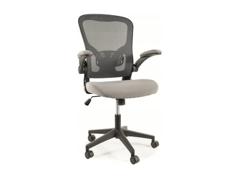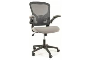 Scaunul este realizat din material textil gri