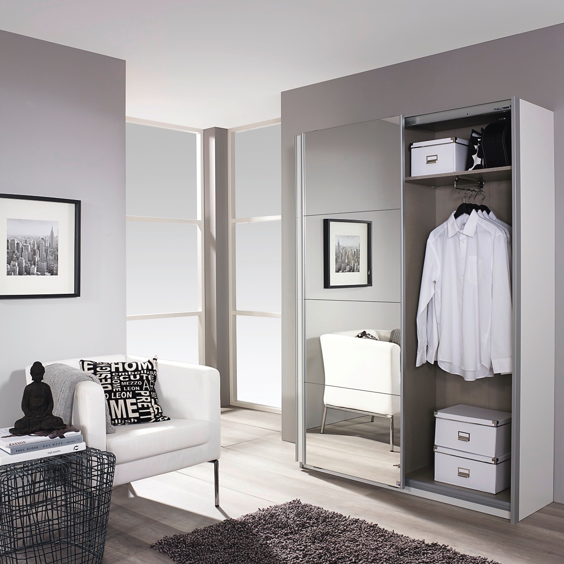 Optează pentru un singur dulap care să înglobeze tot ce ai nevoie: o bară pentru umerașe, polițe pentru pantofi și oglinzi pe uși.