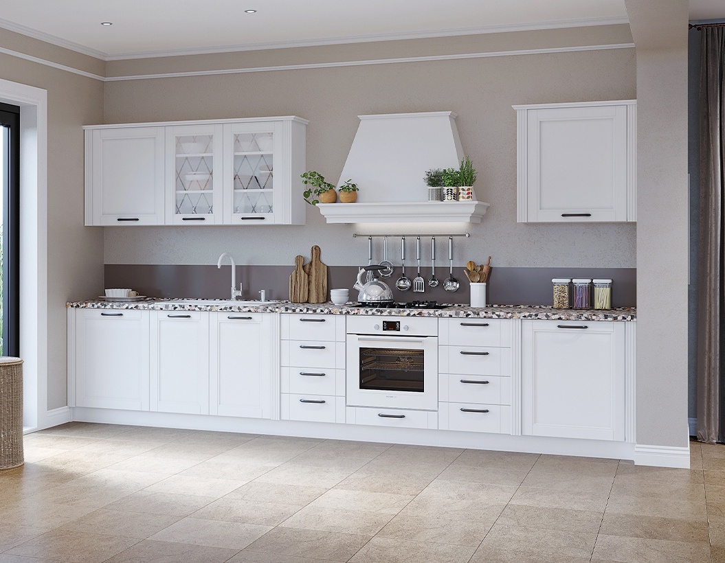 TARA WHITE oferă piese cu fronturi albe mate, frezări clasice și detalii atent lucrate, care transformă spațiul într-un loc rafinat și organizat.