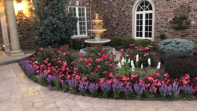 Combină texturi și culori – arbuști, gazon, flori, pietriș decorativ.