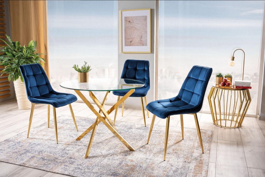 Exemplu: Poți alege un set de scaune cu șezut tapițat în albastru și picioare aurii – combinația perfectă pentru un dining elegant.