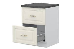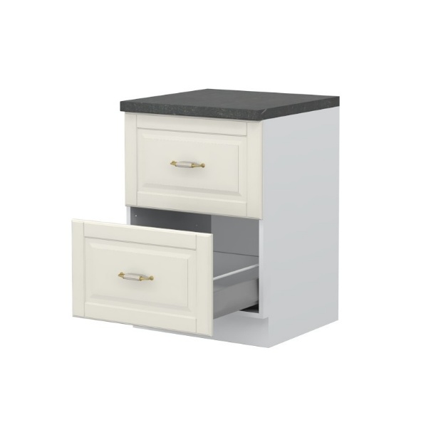 - partea frontală a elementului este realizată dintr-un MDF complet lacuit UV, cu un efect mat moale de culoare fildeș