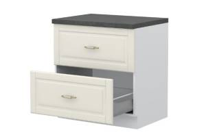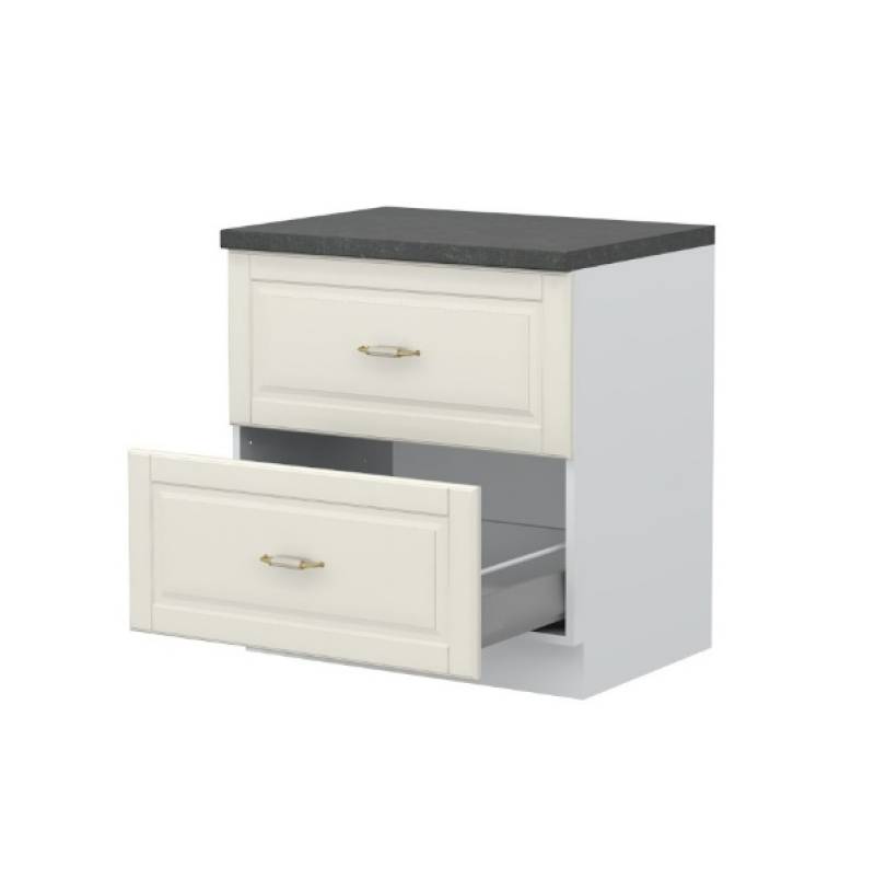 - Partea frontală a elementului este realizată dintr-un MDF complet lacuit UV, cu un efect mat moale de culoare fildeș