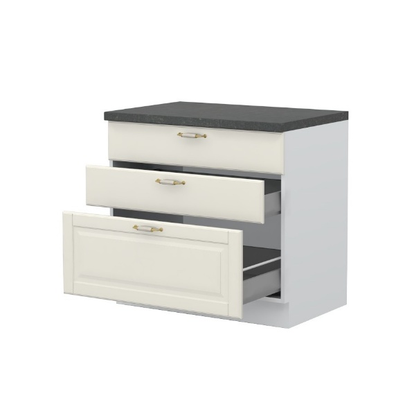 - Partea frontală a elementului este realizată dintr-un MDF complet lacuit UV, cu un efect mat moale de culoare fildeș