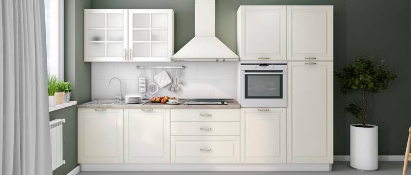- Partea frontală a elementului este realizată dintr-un MDF complet lacuit UV, cu un efect mat moale de culoare fildeș