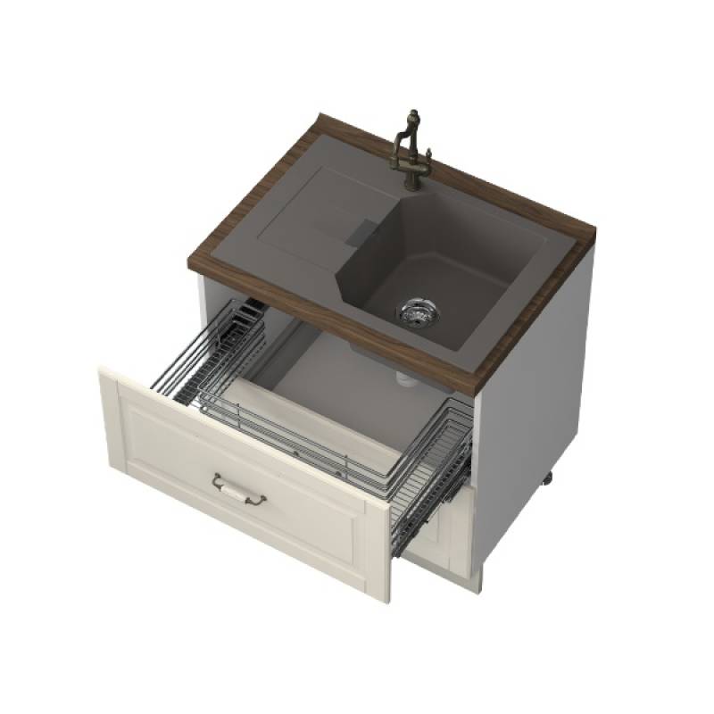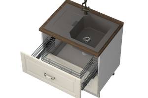 - Partea frontală a elementului este realizată dintr-un MDF complet lacuit UV, cu un efect mat moale de culoare fildeș