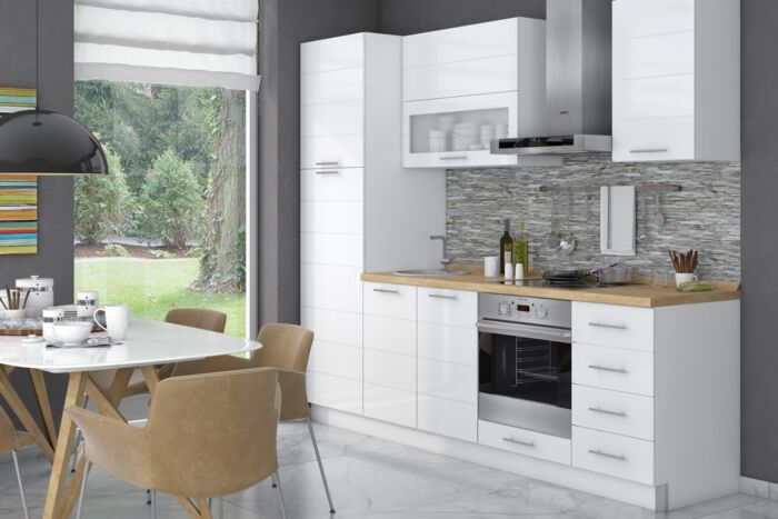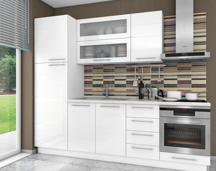 - Partea frontală a elementelor este din MDF profilat cu folie lucioasă în orice culoare din paleta de culori oferită