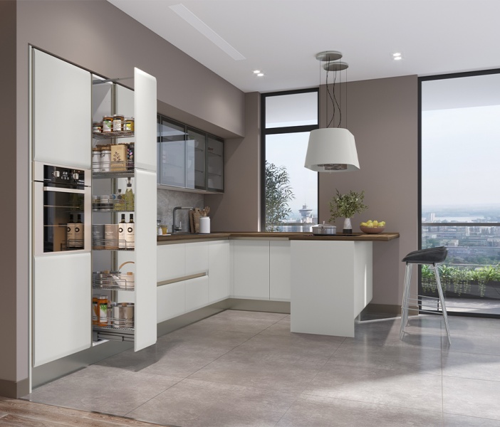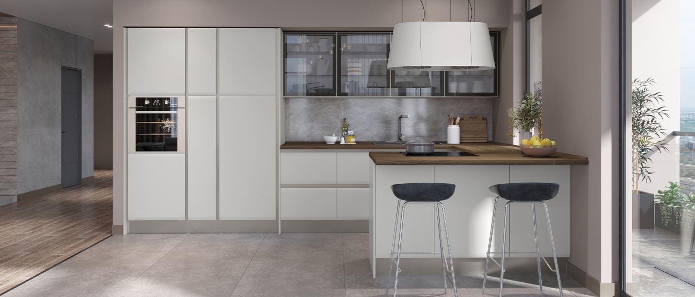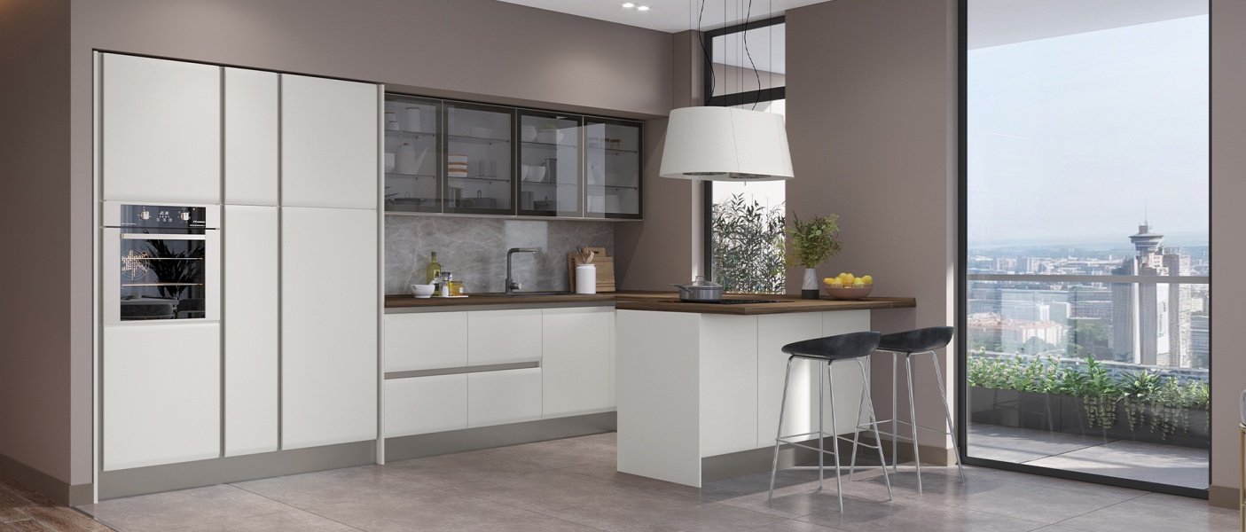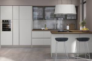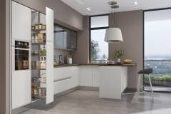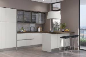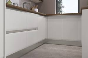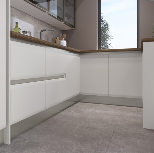 - Fronturile elementeor sunt realizate din MDF cu design rotunjit complet lacuit cu lac UV de culoare casmir cu un efect mat moale.