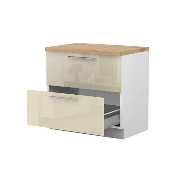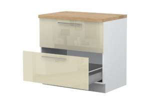 - Partea frontală a elementului este din MDF profilat, infoliat (nuante disponibile: alb lucios sau bej lucios) (18mm)