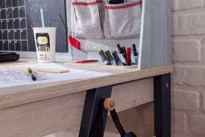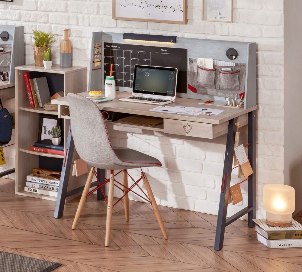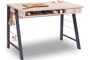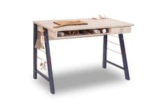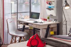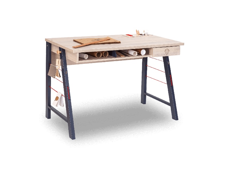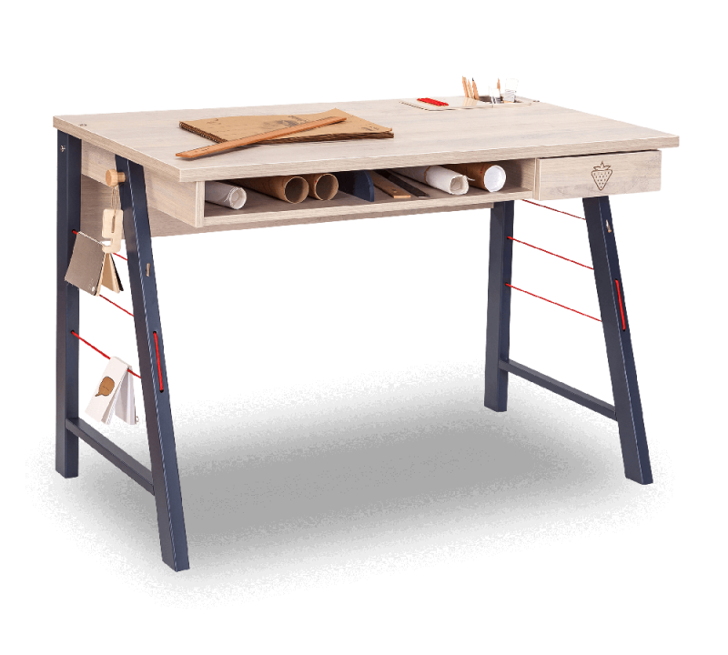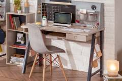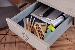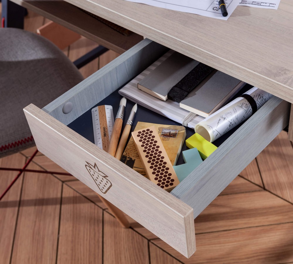 Biroul are un sertar si un spatiu deschis pentru depozitare.