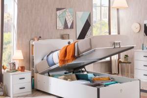 Patul din pal are lada de depozitare.