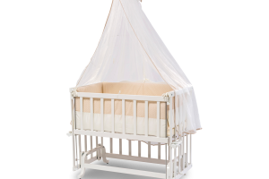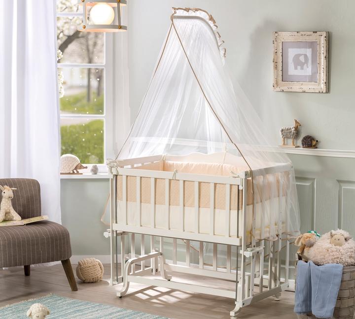 Produsul include, de asemenea, un set de protecție laterală, saltea, pernă decorativă și baldachin