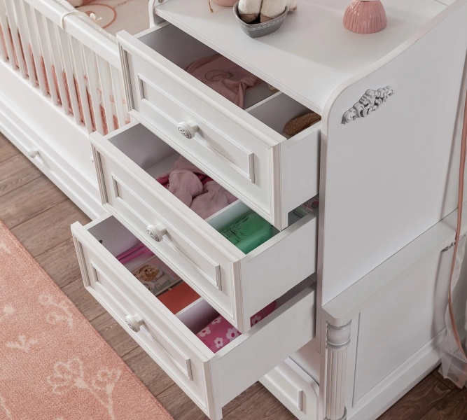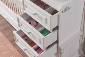 Patutul transformabil pentru bebe poate fi util pentru o perioada indelungata, transformandu-se in pat pentru o persoana si doua noptiere cu sertare sau cu rafturi.