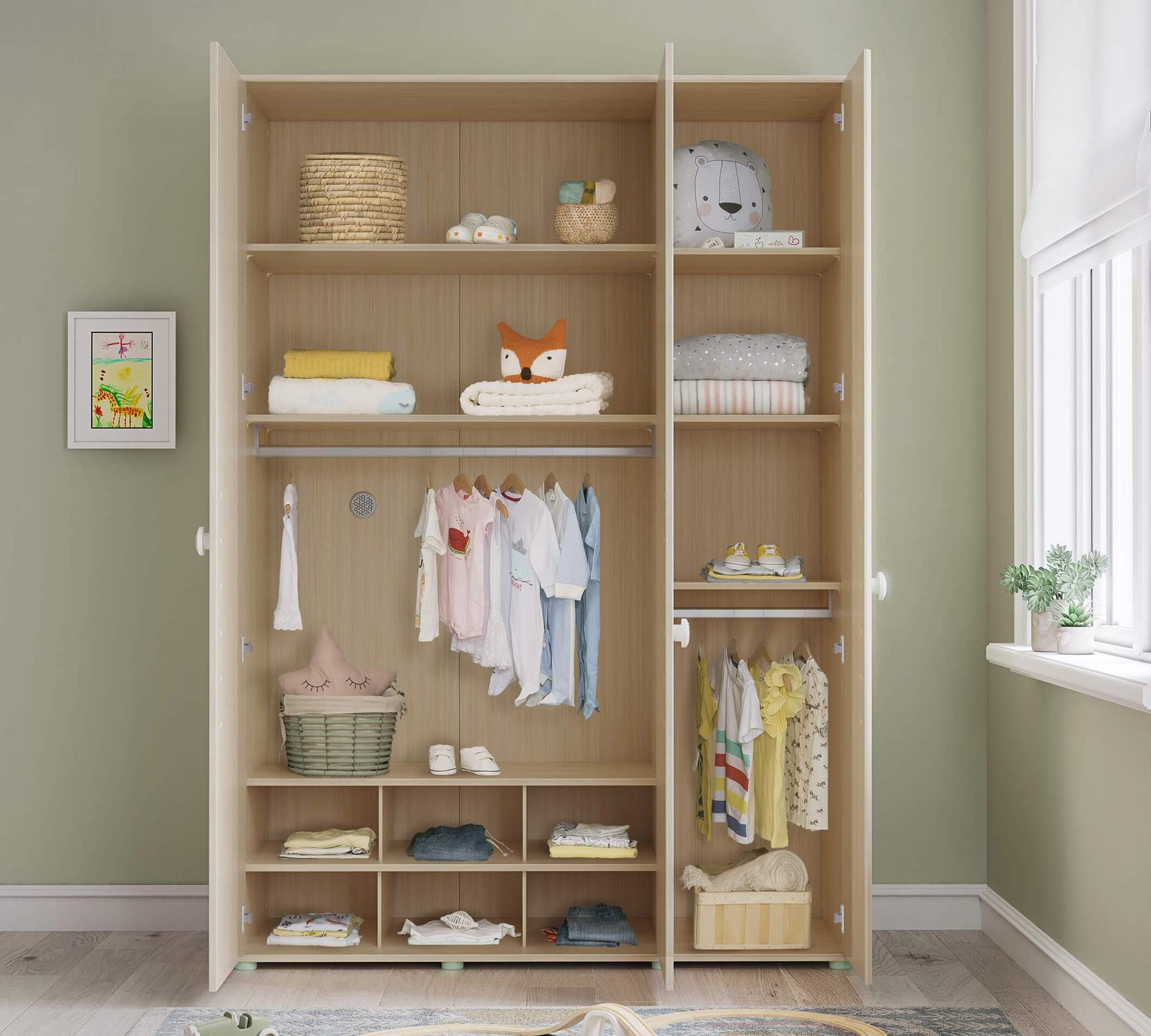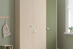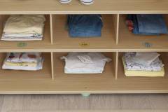Rafturile și umerașele din garderobă sunt concepute în funcție de înălțimea copilului, de raporturile de vârstă si cu un sistem mobil aleatoriu în trei etape.