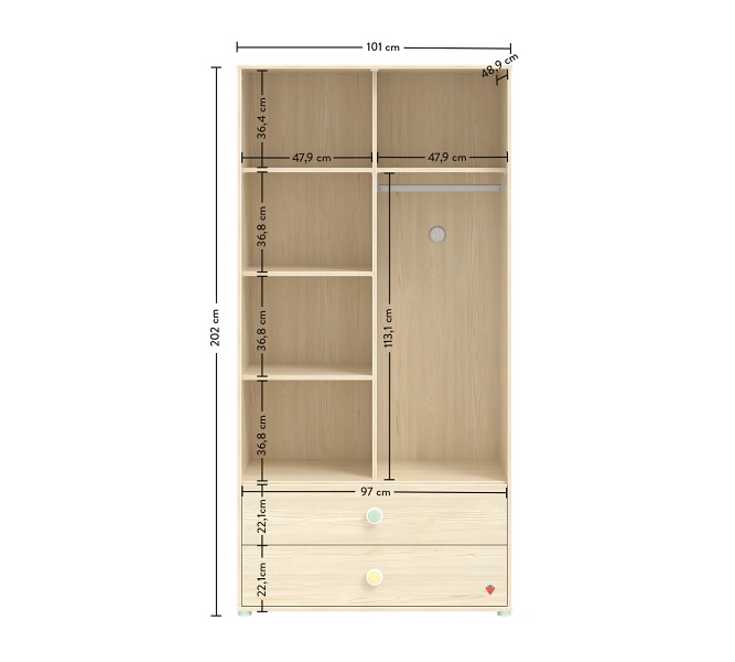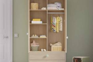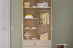 Rafturile și umerașele din garderobă sunt concepute în funcție de înălțimea copilului, de raporturile de vârstă si cu un sistem mobil aleatoriu în trei etape.