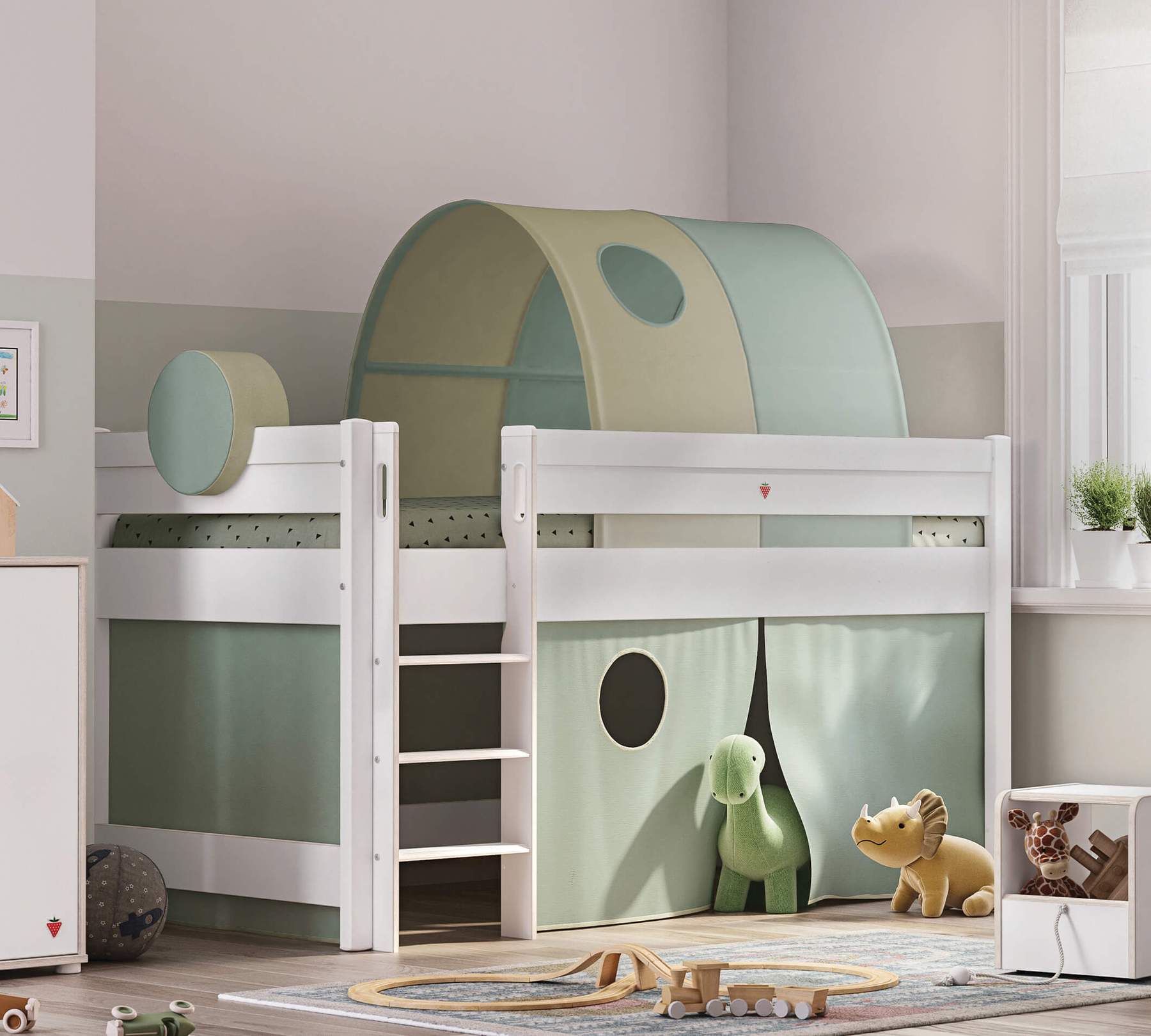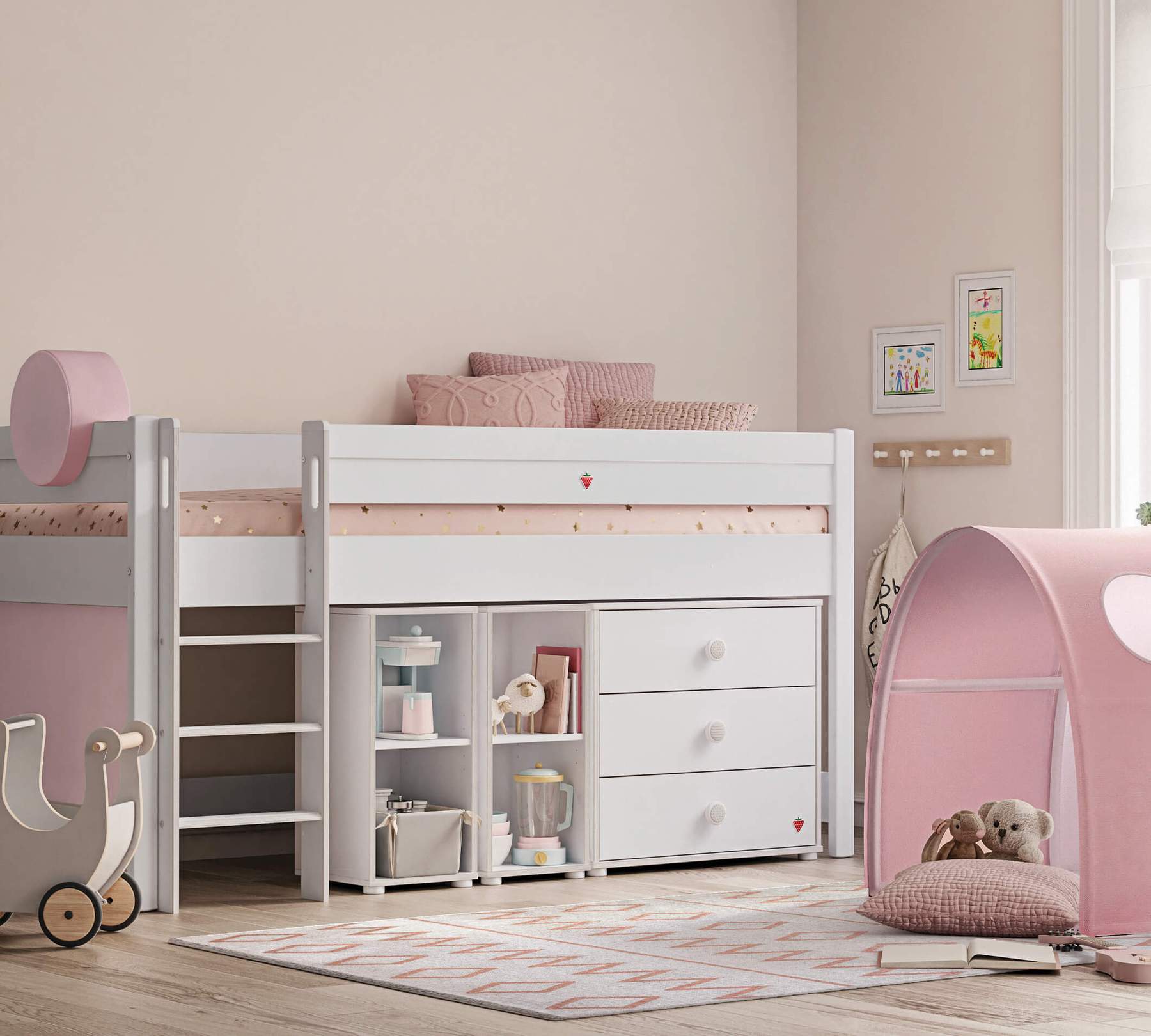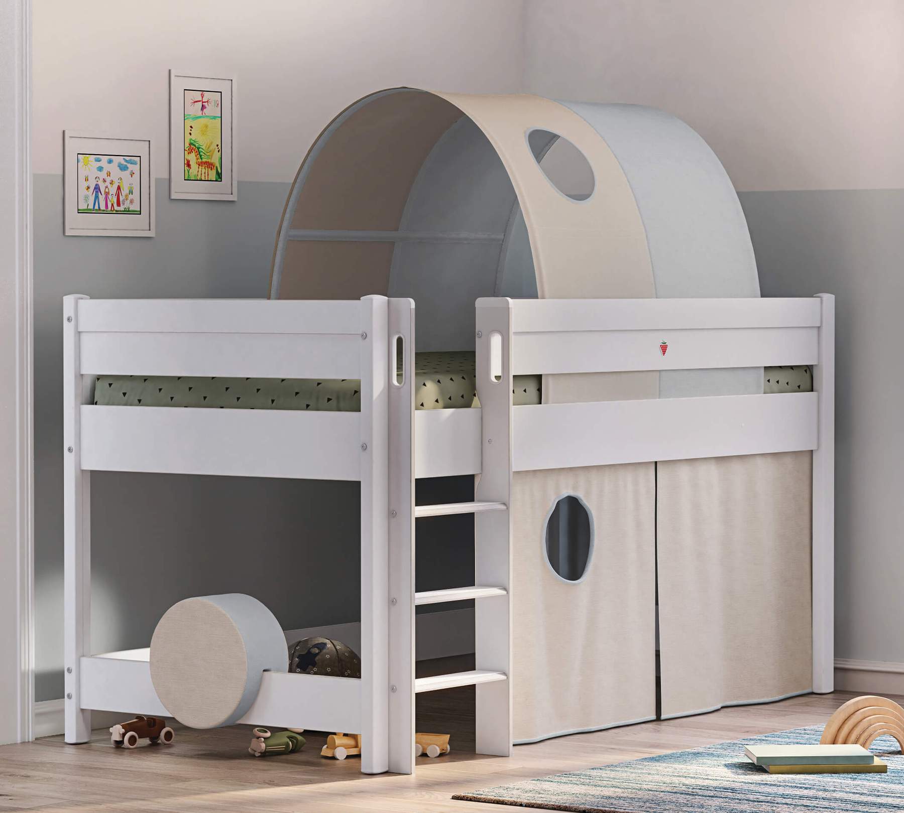 Pretul afisat NU INCLUDE montajul, salteaua, copertina, cortul, taburetul, comoda, biclioteca, perna rotunda si accesoriile din imaginea de prezentare a produsului, acestea putand fi achizitionate separat.