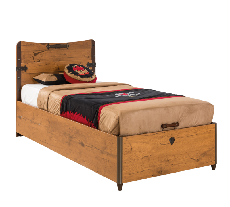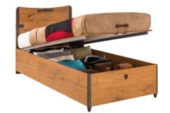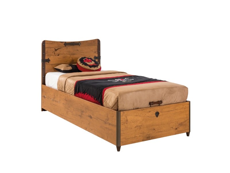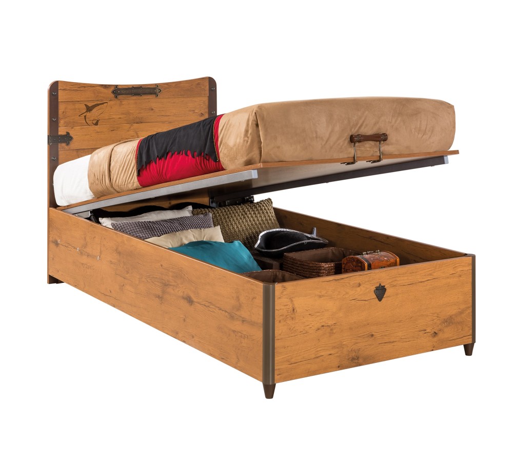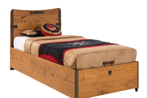 Patul din pal are lada pentru depozitare.