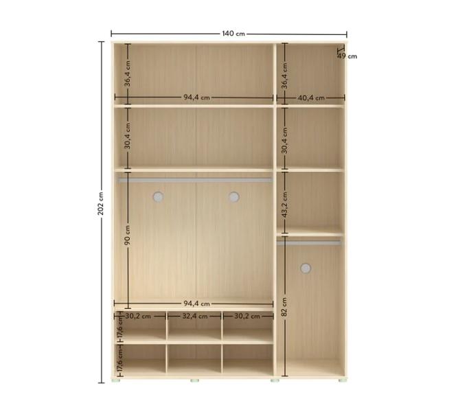 Rafturile și umerașele din garderobă sunt concepute în funcție de înălțimea copilului, de raporturile de vârstă si cu un sistem mobil aleatoriu în trei etape.
