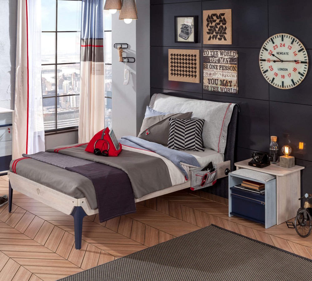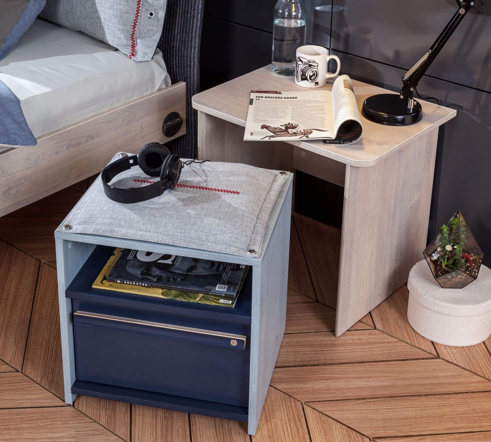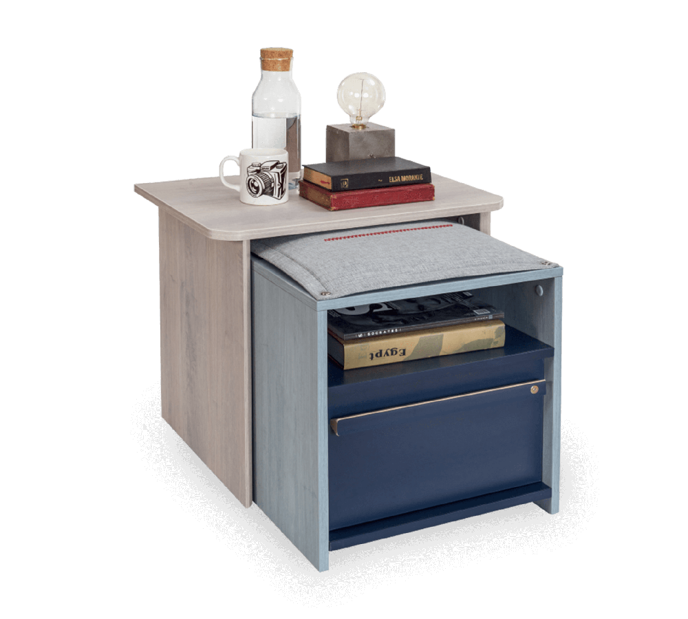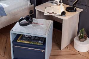Colectia Trio: dormitor modern în nuanțe de natur / albastru deschis / albastru inchis, perfect pentru un stil contemporan. Designul simplu, dar funcțional, oferă confort și organizare, adaptându-se nevoilor adolescentului tău. Creează un spațiu armonios și personalizat!