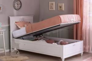 Patul din pal are lada de depozitare.