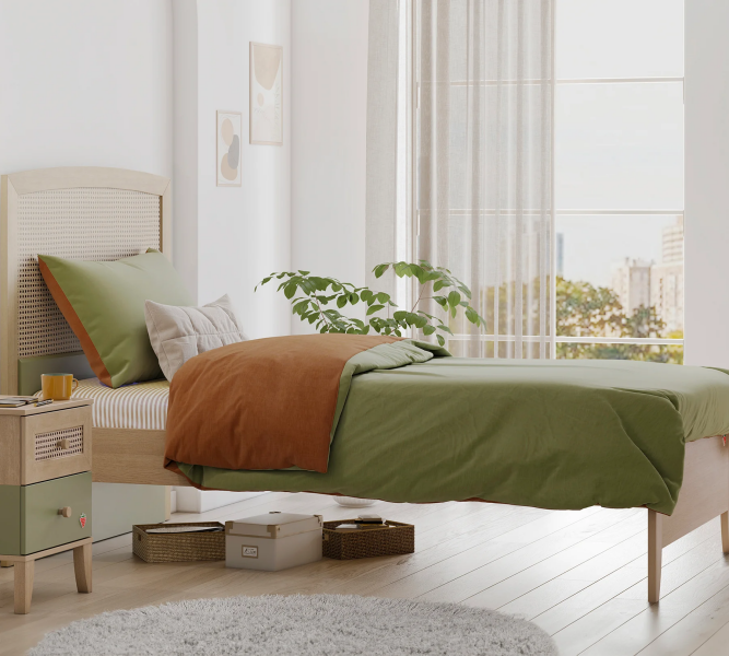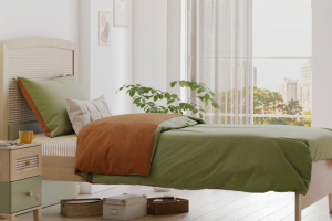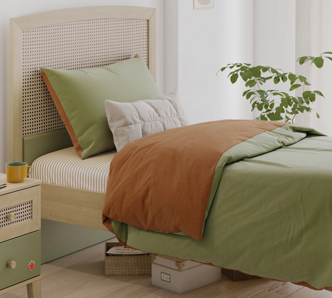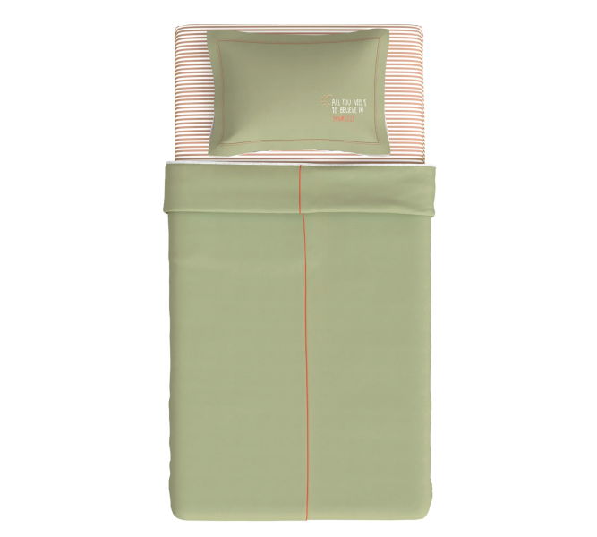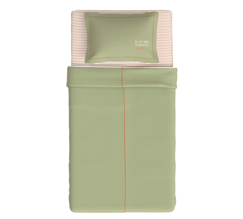 Este format din 3 părți: cuvertură de pat, față de pernă și cearșaf.