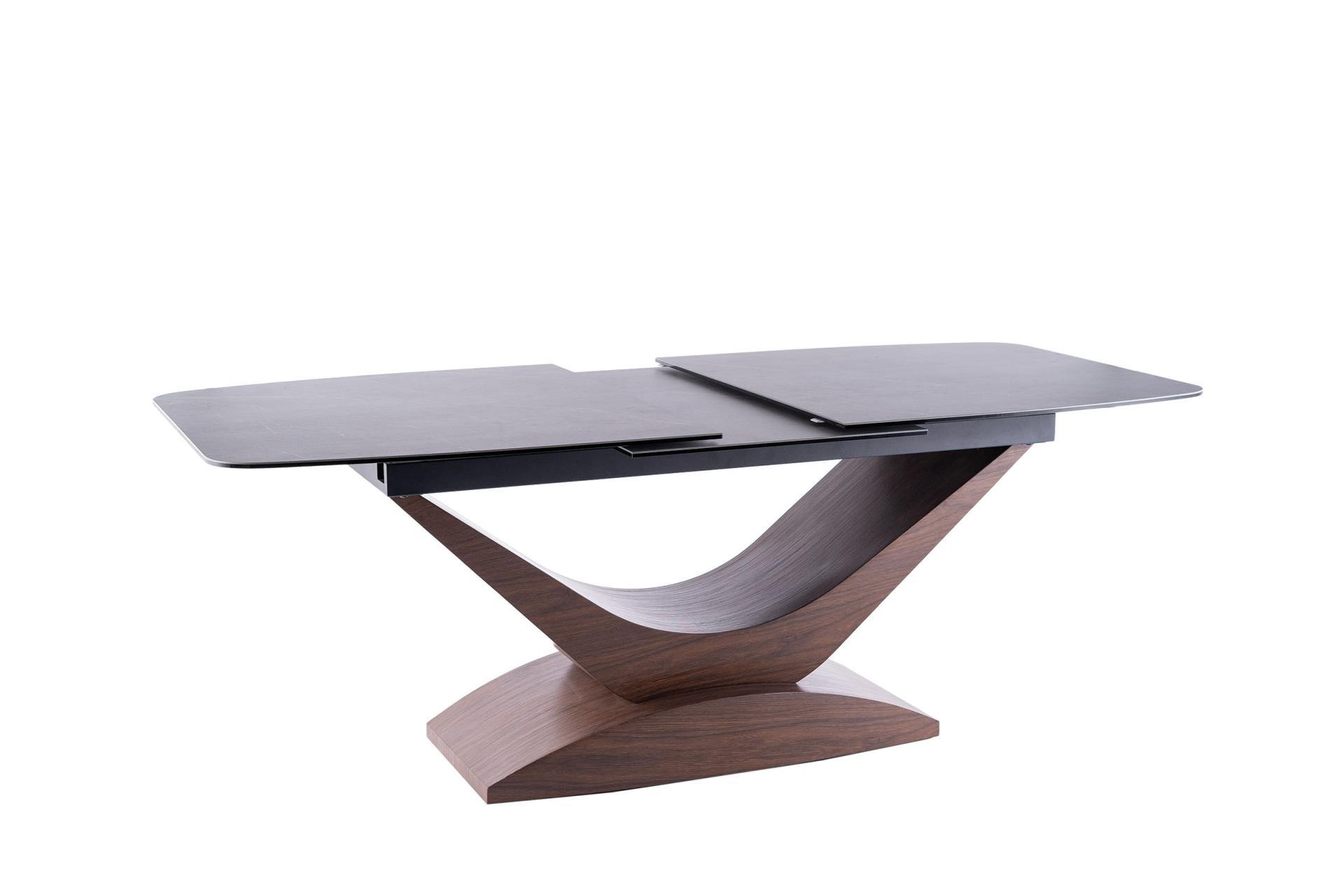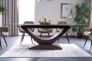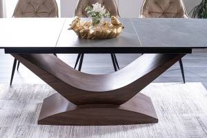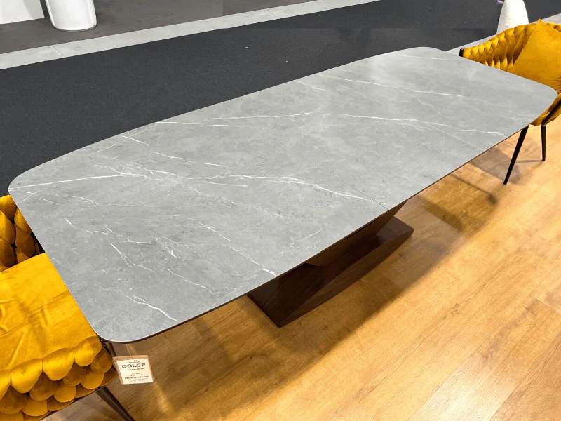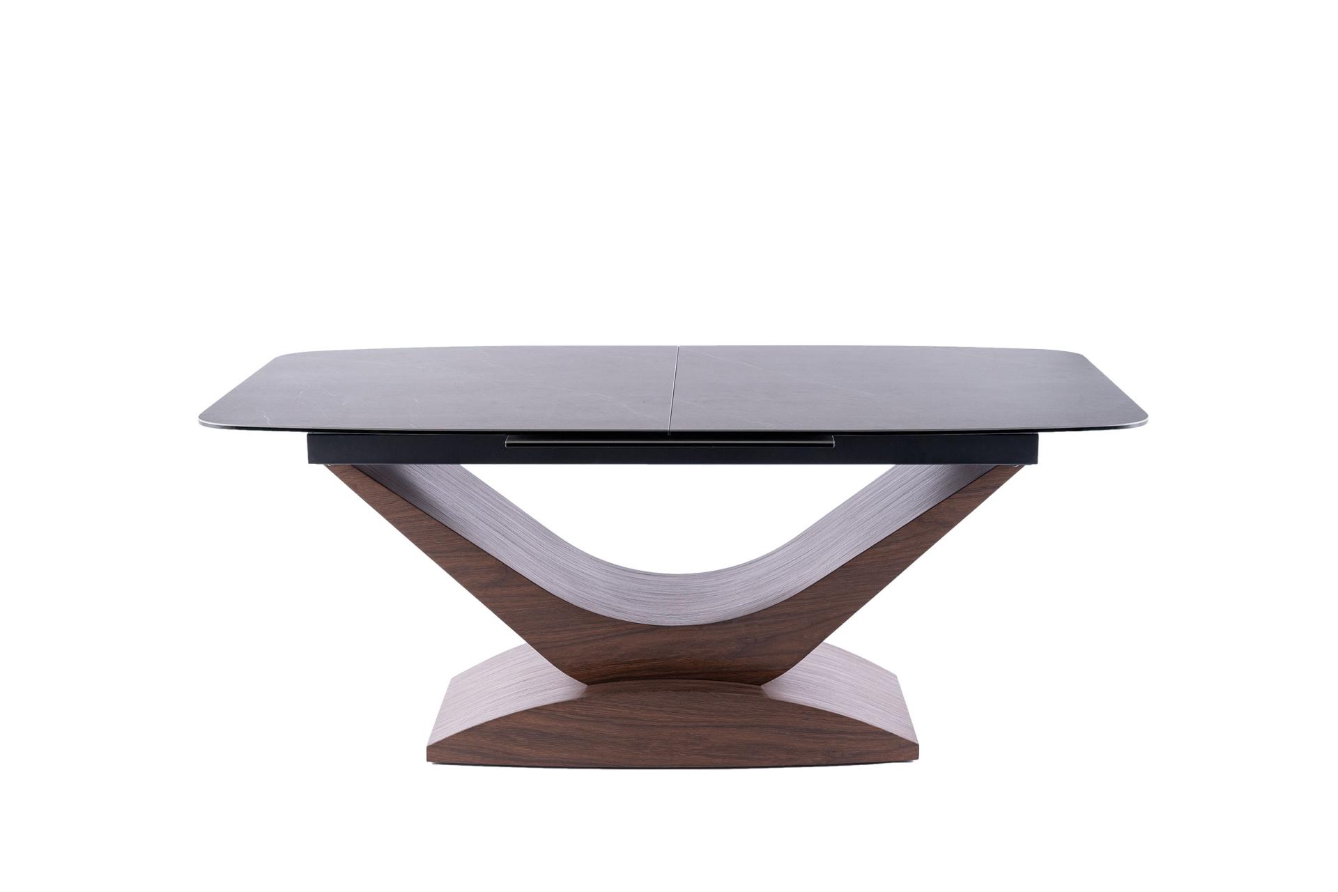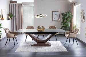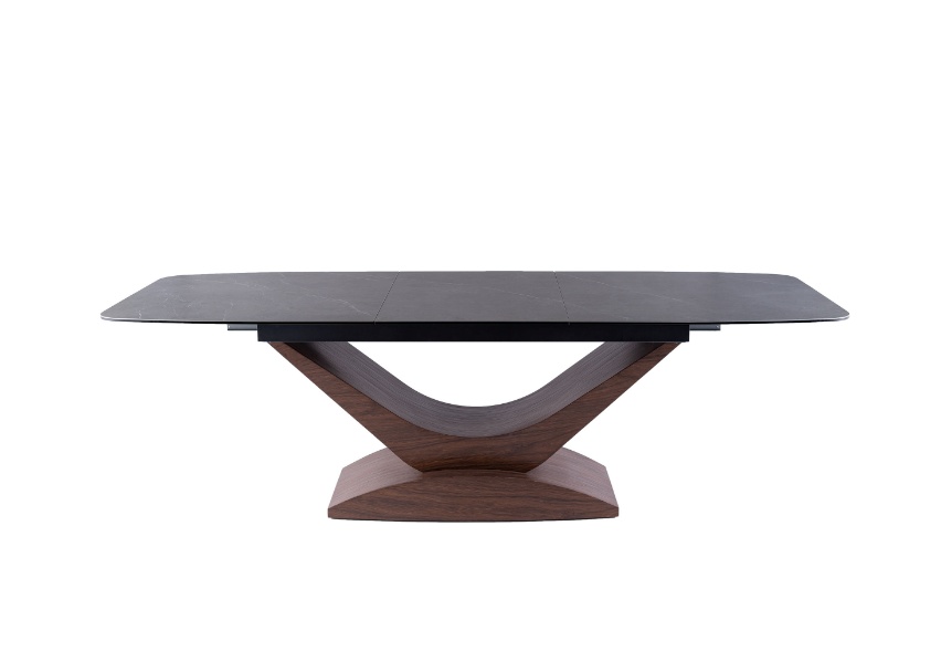 Masa extensibila DOLCE CERAMIC, cu blat din sticla securizata cu efect ceramic, ofera un design modern si elegant. Finisajul in nuante de gri si nuc adauga caldura si rafinament oricarui spatiu!