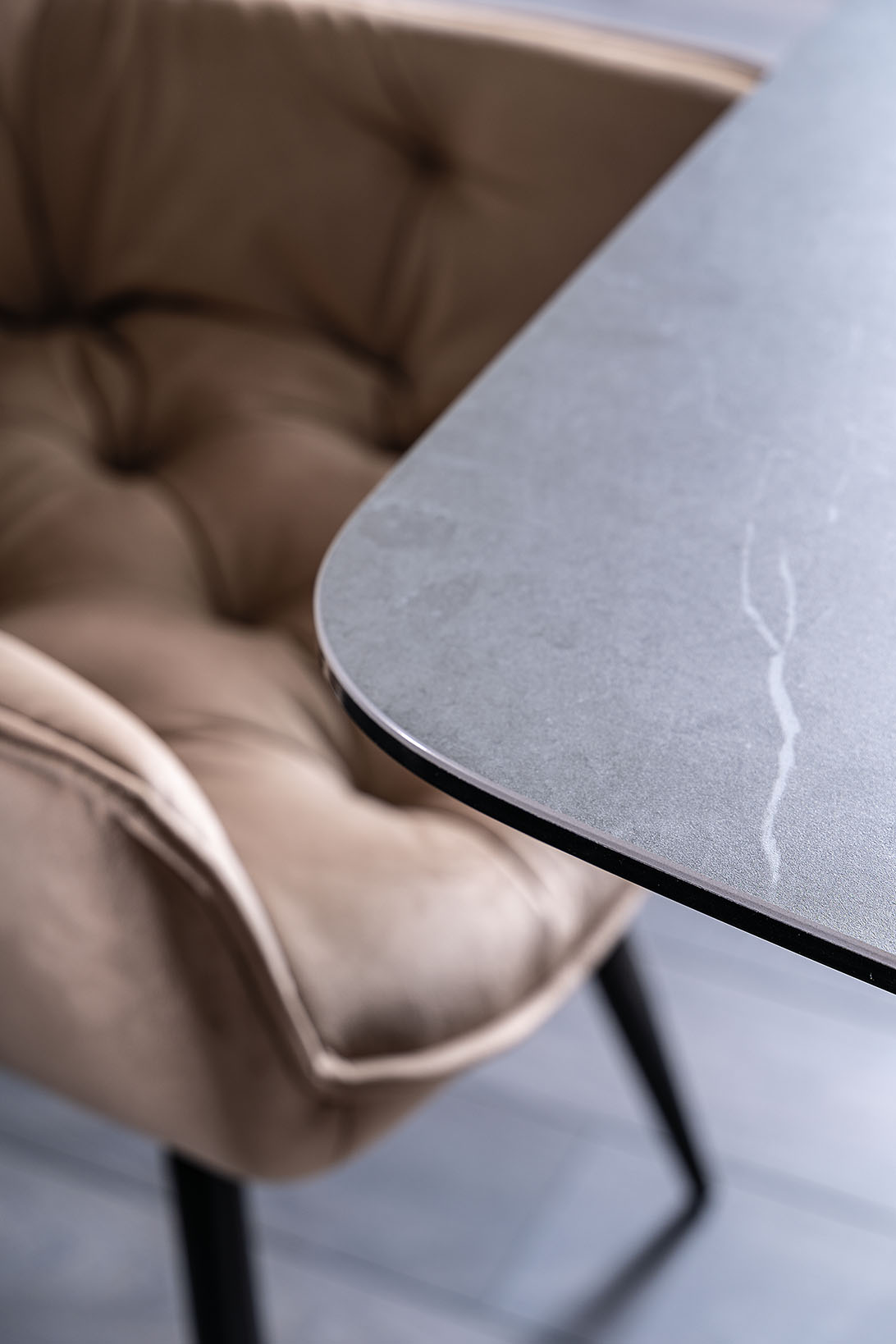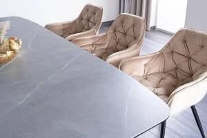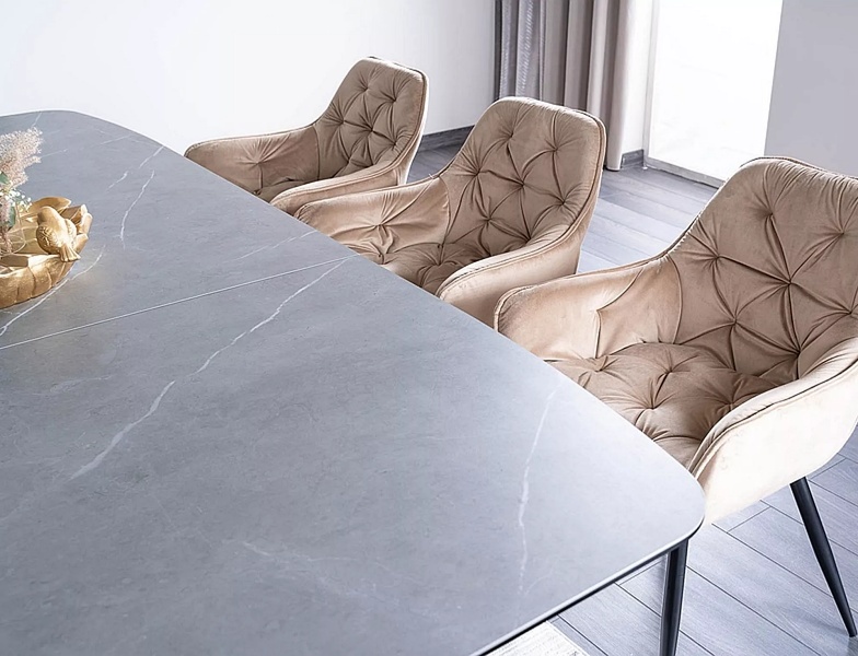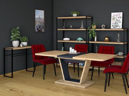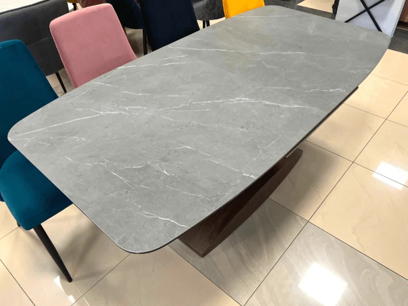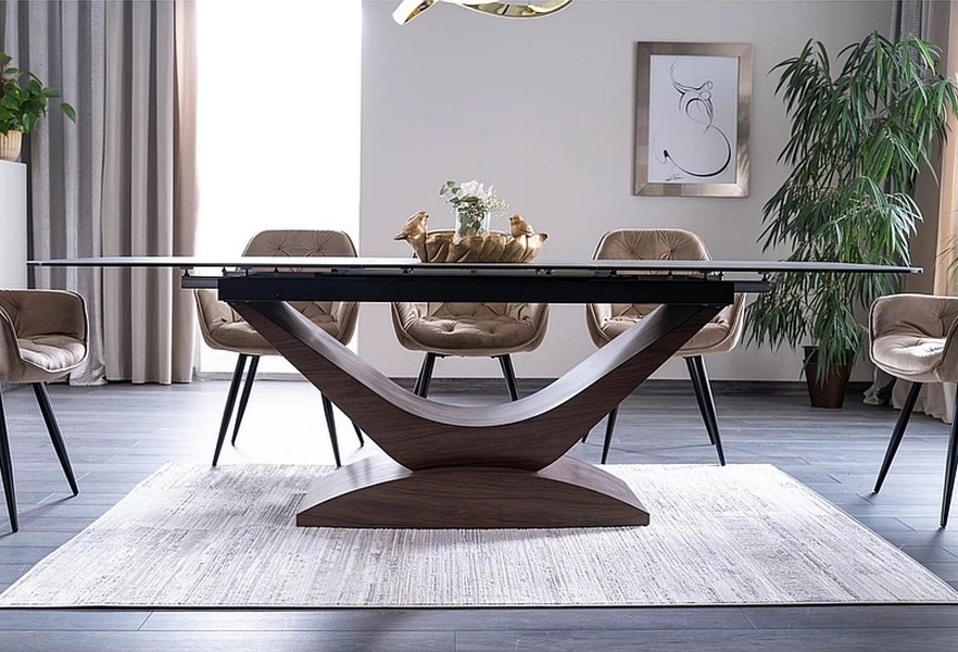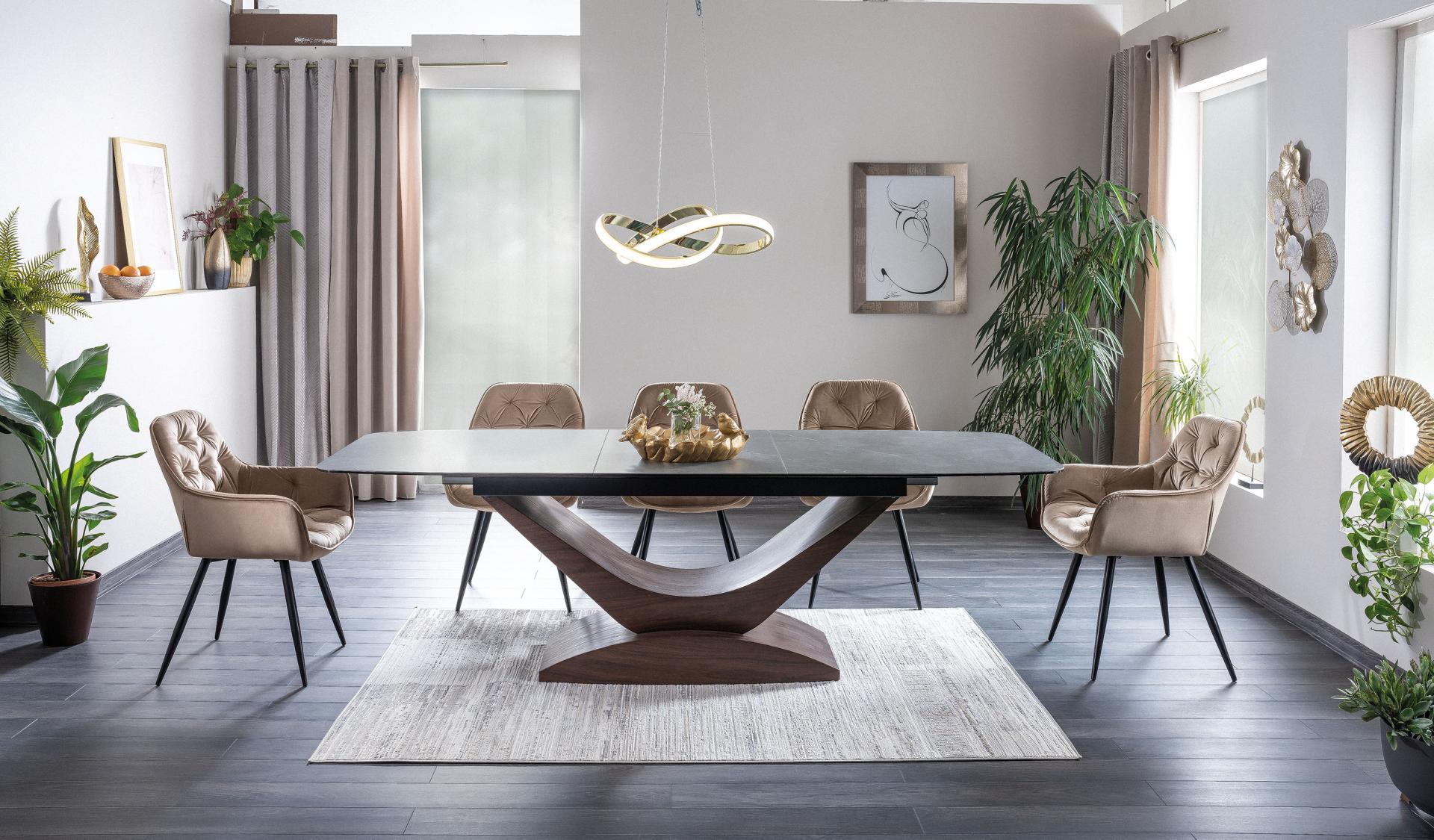 Masa extensibila DOLCE CERAMIC, cu blat din sticla securizata cu efect ceramic, ofera un design modern si elegant. Finisajul in nuante de gri si nuc adauga caldura si rafinament oricarui spatiu!