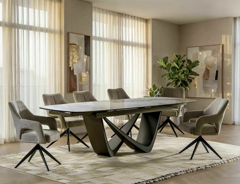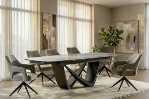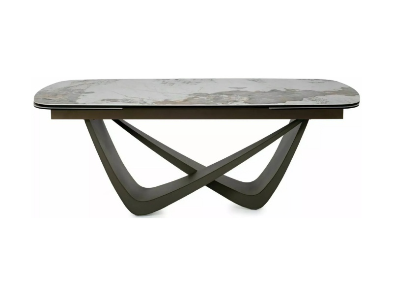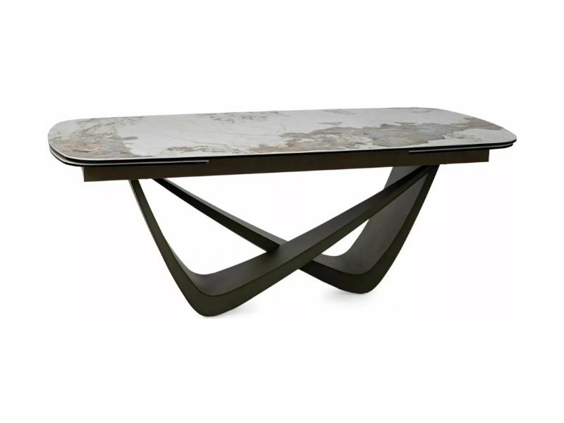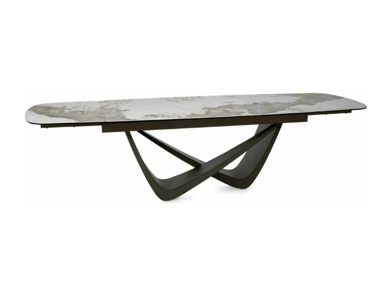 Masa extensibila MARANELLO CERAMIC PANDORO din sticla securizata si ceramica Pandoro alb lucios, metal cupru 200-290x90xH77cm