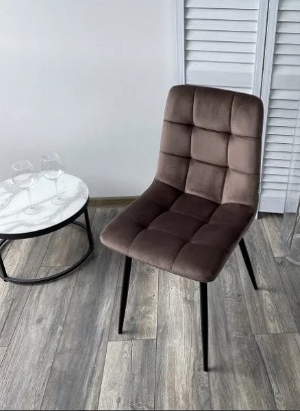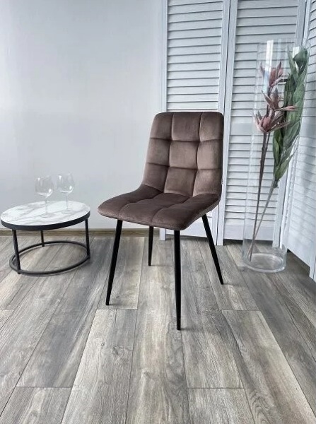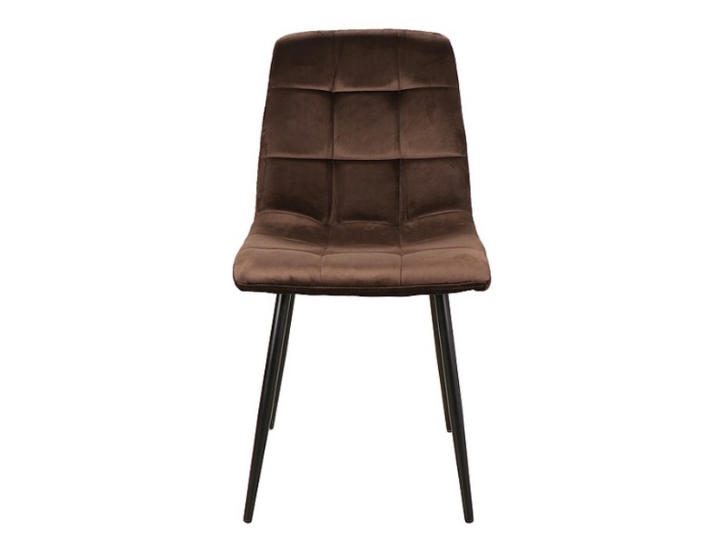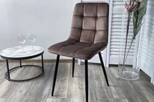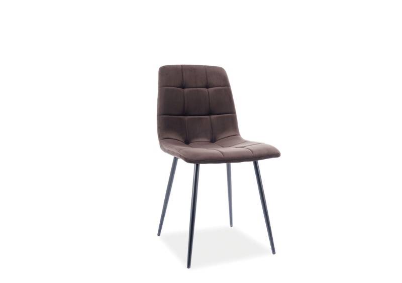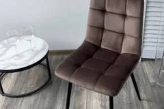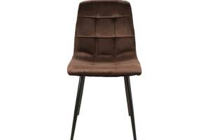Scaun MILA VELVET din catifea maro Bluvel 48, cu picioare metalice negre. Design elegant si modern, ideal pentru interioare sofisticate. Confort si durabilitate intr-un singur produs!