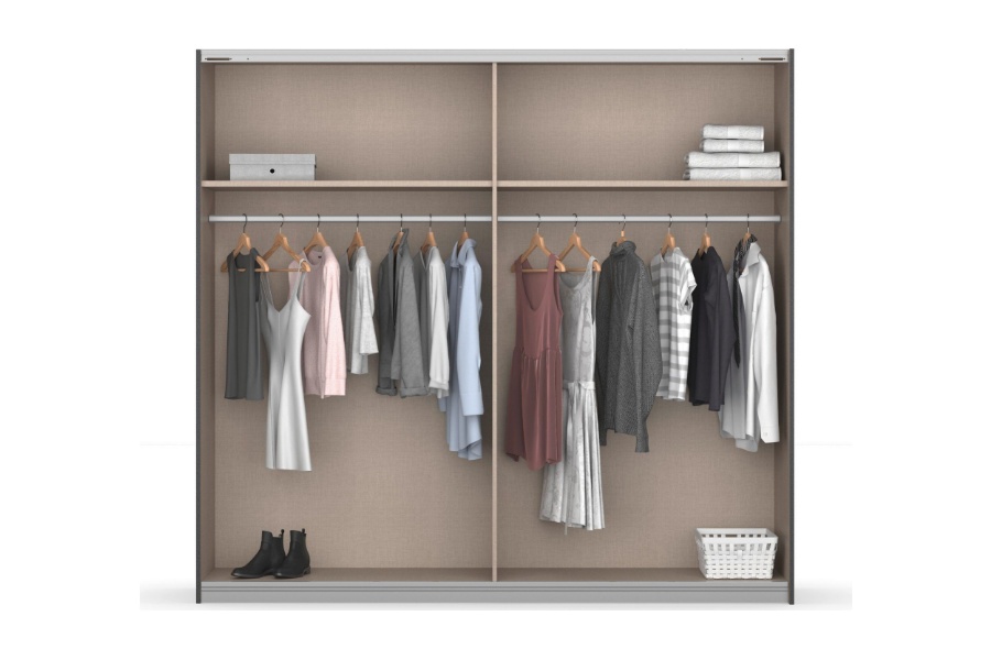- Compartimentare: Dulapul are starndard o polita si o bara pentru umerase pentru fiecare compartiment in parte (2 polite + 2 bari)