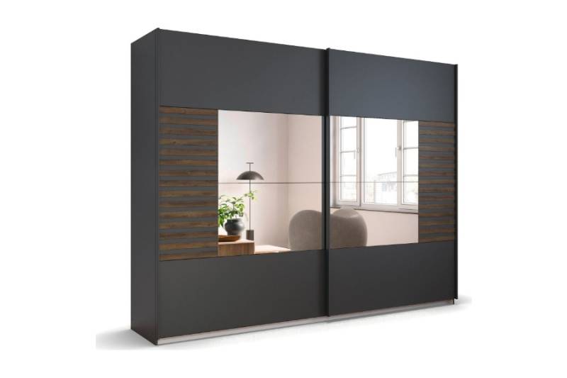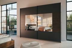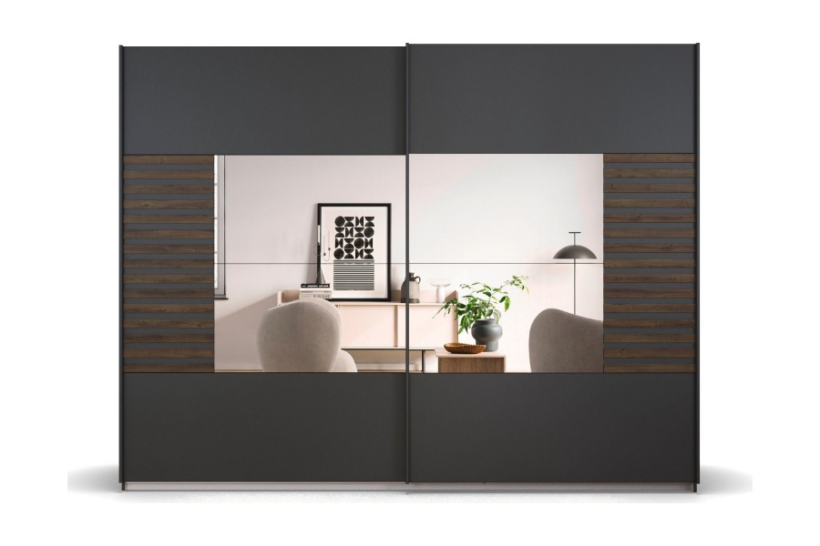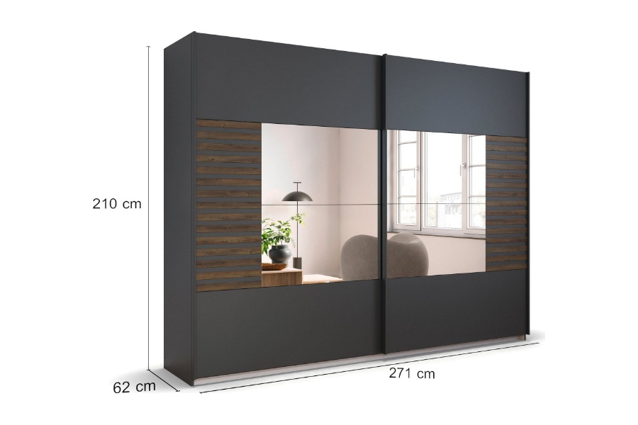 Dulap cu usi glisante BAREA 271x210x62cm gri metalic + stejar Atlantic dark - oglinda, maner gri metalic
