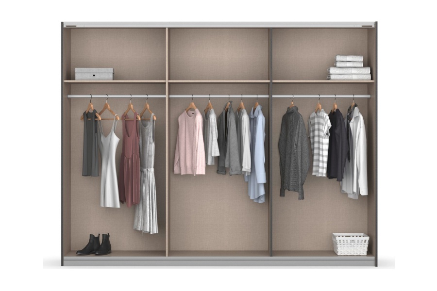 - Compartimentare: Dulapul are starndard o polita si o bara pentru umerase pentru fiecare compartiment in parte (3 polite + 3 bari)