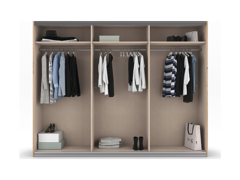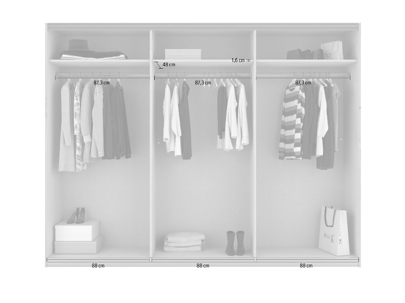 - Dulapul are inclusa 1 polite si 1 bara pentru umeras pentru fiecare compartiment, in total 3 polite si 3 bare pentru umerase de 88x48cm.