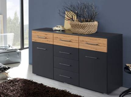 Comoda cu 2 usi si 6 sertare BOSTON EXTRA 140x81x42cm gri metalic/ stejar