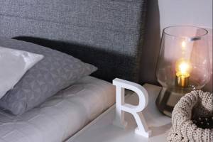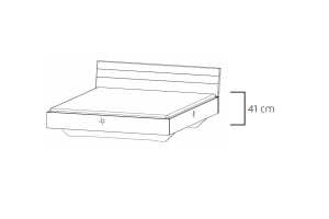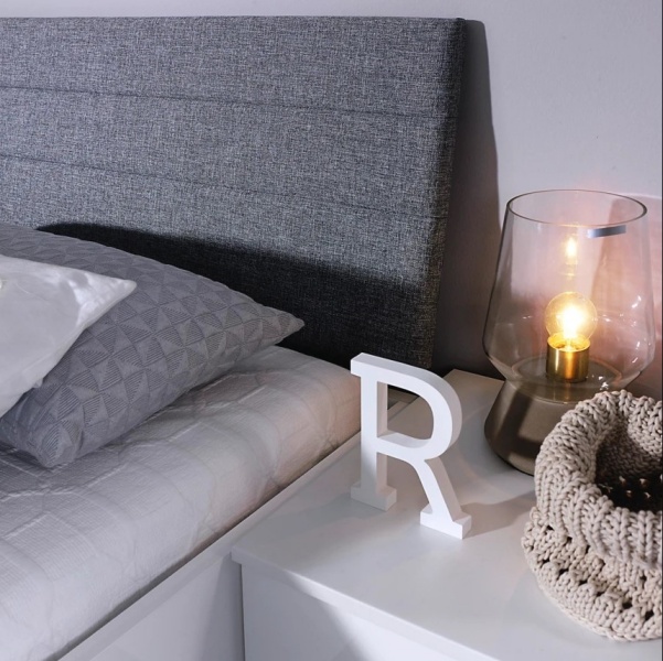 Tablia patului este tapitata cu material textil nuanta gri.