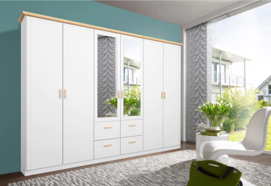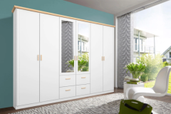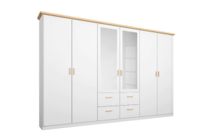 Dulap cu 6 usi cu balamale si 4 sertare KOLDING 277x214x57cm alb alpin/ oglinda, manere si decor frasin Coimbra