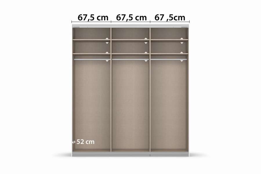 - Dulapul are inclus 2 polite si 1 bara pentru umeras pentru fiecare compartiment, in total 6 polite 66x48cm si 3 bare pentru umerase.