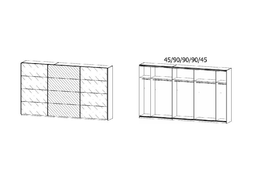 - Pentru compartimentele de 90cm dulapul are inclus 1 polita si 1 bara pentru umeras, in total 3 polite 88x48cm si 3 bare pentru umerase.