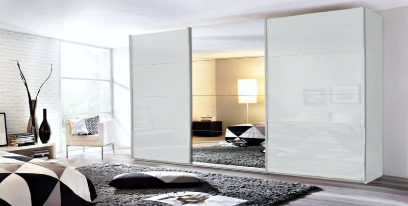 Dulap cu usi glisante KULMBACH 361x229x62cm alb alpin/ sticla alba-oglinda configurabil