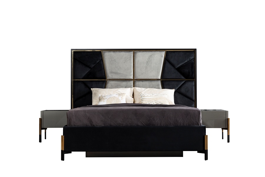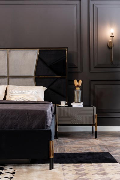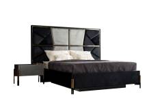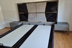 Patul este tapitat cu material catifelat nuanta albastru inchis