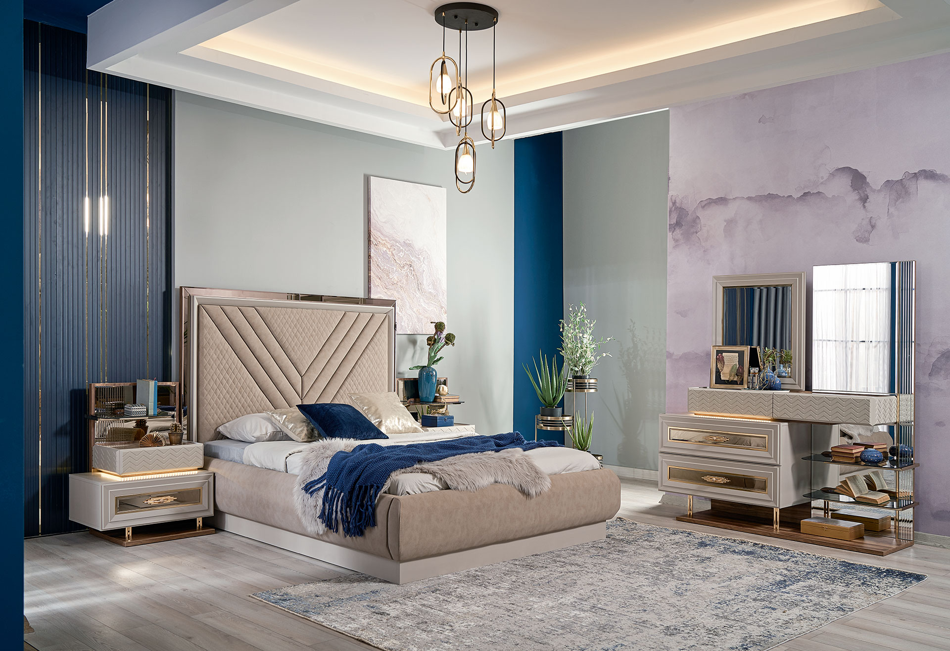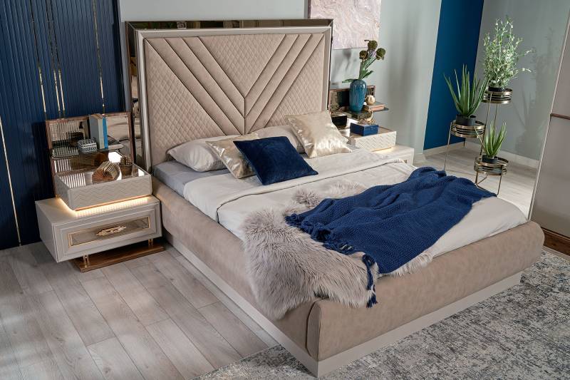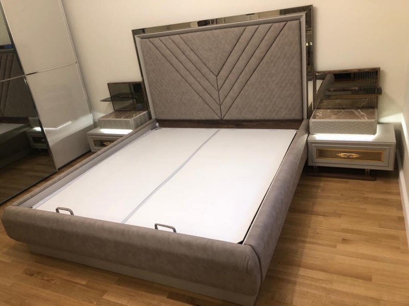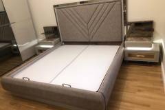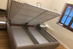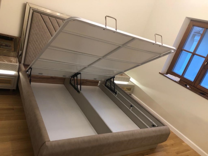 Patul este prevazut cu spatiu pentru depozitare tip lada si cu somiera (sistem de rabatare cu pistoane pe gaz)