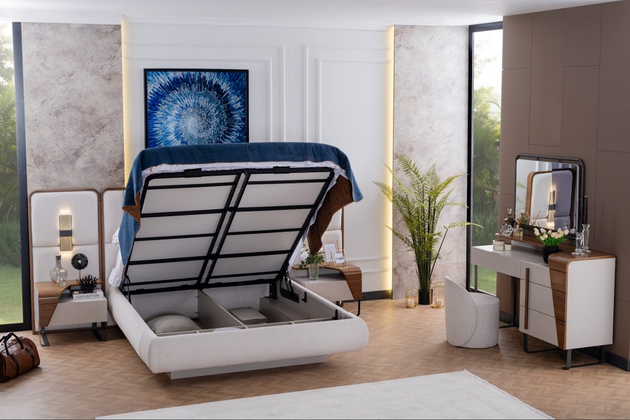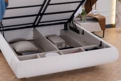 Patul este prevazut cu spatiu pentru depozitare tip lada si cu somiera (sistem de rabatare cu pistoane pe gaz)