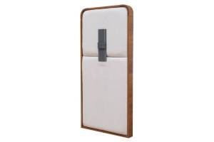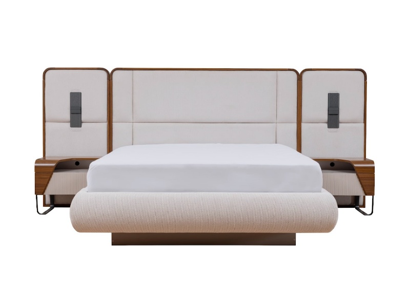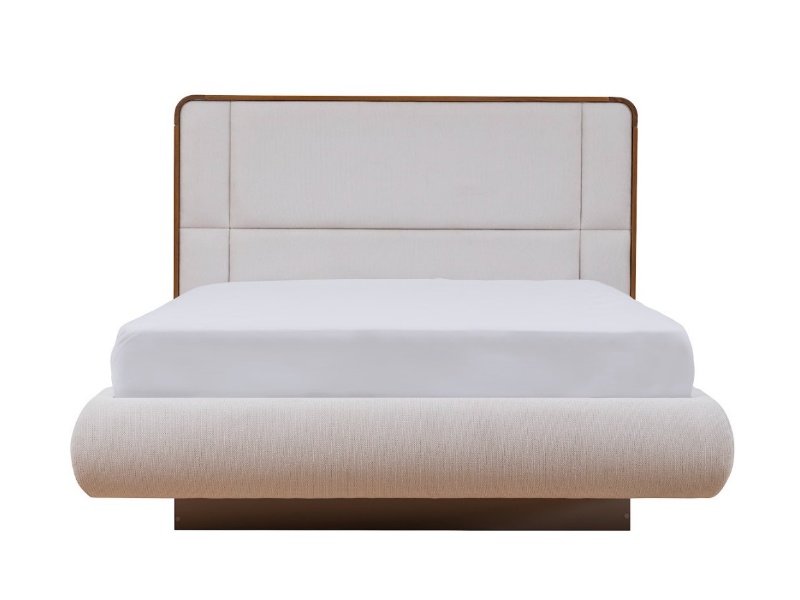 Patul este tapitat cu material textil nuanta crem in combinatie cu nuanta lemnului.