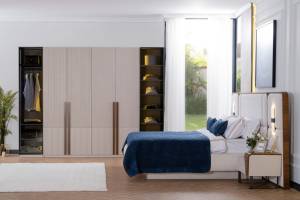 Setul contine: un dulap cu 6 usi (4 usi decor + 2 usi sticla), un pat 160x200cm, o comoda + oglinda, un taburet, 2 noptiere, 2 tablii de la noptiere