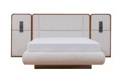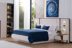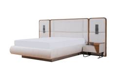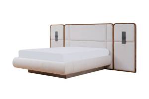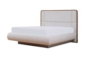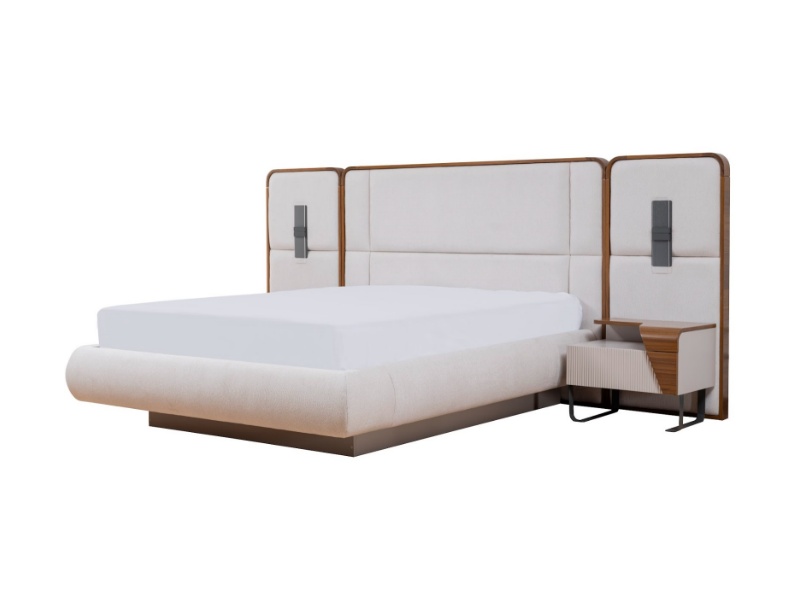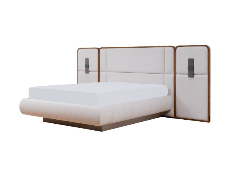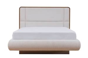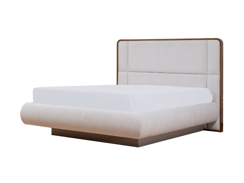 Patul este tapitat cu material textil nuanta crem in combinatie cu nuanta lemnului.