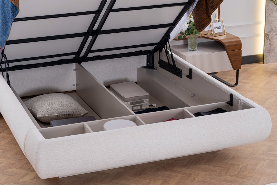 Patul este prevazut cu spatiu pentru depozitare tip lada si cu somiera (sistem de rabatare cu pistoane pe gaz)